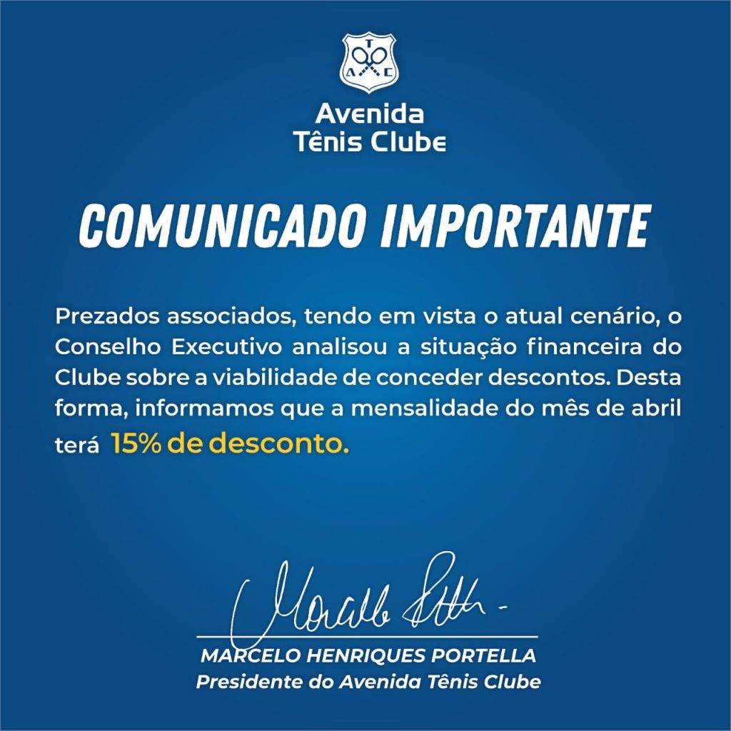 O Presidente do Conselho Executivo do Avenida Tênis Clube, no uso de suas atribuições estatutárias e de acordo com o art. 33 do Estatuto do Clube, convoca todos os associados votantes à ASSEMBLÉIA GERAL ORDINÁRIA ELETIVA a ser realizada no dia 27 de maio de 2021, às 13h30min em primeira chamada e às 14h em […]